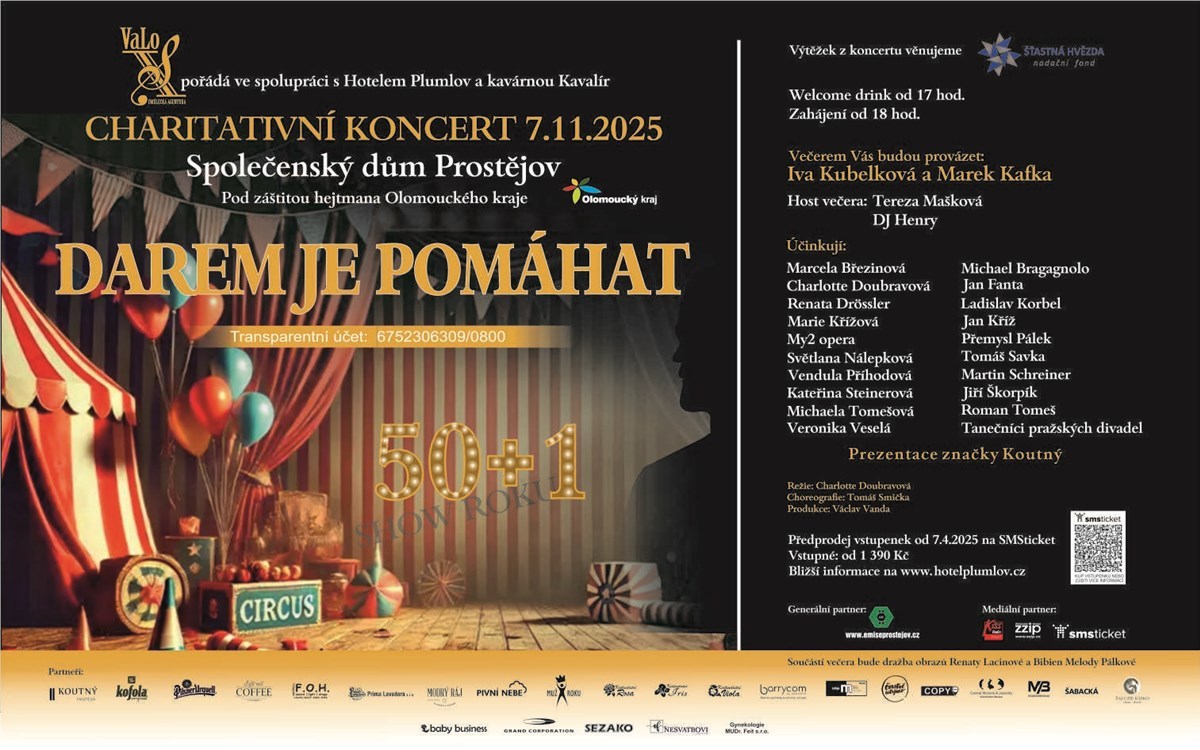Výtěžek tohoto koncertu bude pro Téměř sedmiletou holčičku, která od narození čelí těžké cévní malformaci v centrálním mozku. Toto onemocnění vážně omezuje její pohyb a každodenní aktivity a vyžaduje neustálou péči. Bohužel v České republice není dostupná léčba, která by mohla její stav zlepšit. Jedinou nadějí je specializované pracoviště v Římě, kde je možné provést zákrok, který by mohl Eliščin život významně změnit a dát jí šanci na větší samostatnost a lepší kvalitu života.