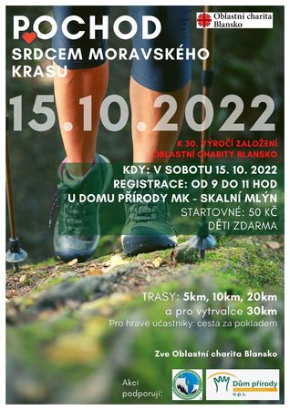 V sobotu 15. října zveme na Pochod ke 30. výročí Charity Blansko. Start je od 9 do 11 hodin u Domu přírody. U startu si vyberete jednu z turisticky značených tras 5, 10, 20 nebo 30 km.