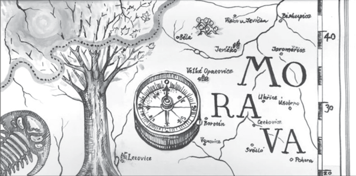 Výtvarný jazyk, který jsem v návrhu použila, je odkazem na místní kulturní dědictví - mapy a jejich minulost. Mapa je podkladem celého muralu. Motiv stromu nabízí průhled do parku, jeho větve prorůstají mapou a splývají s řekami. Strom se tak stává součástí mapy. Na mapě je položený kompas, který je nejen odkazem ke kartografii, ale také určuje návštěvníkům města světové strany. V levém dolním rohu je trilobit, osvětlující originální inspiraci jedinečného projektu Moravského kartografického centra. Teplé sluneční světlo vnáší do obrazu barevný akcent.